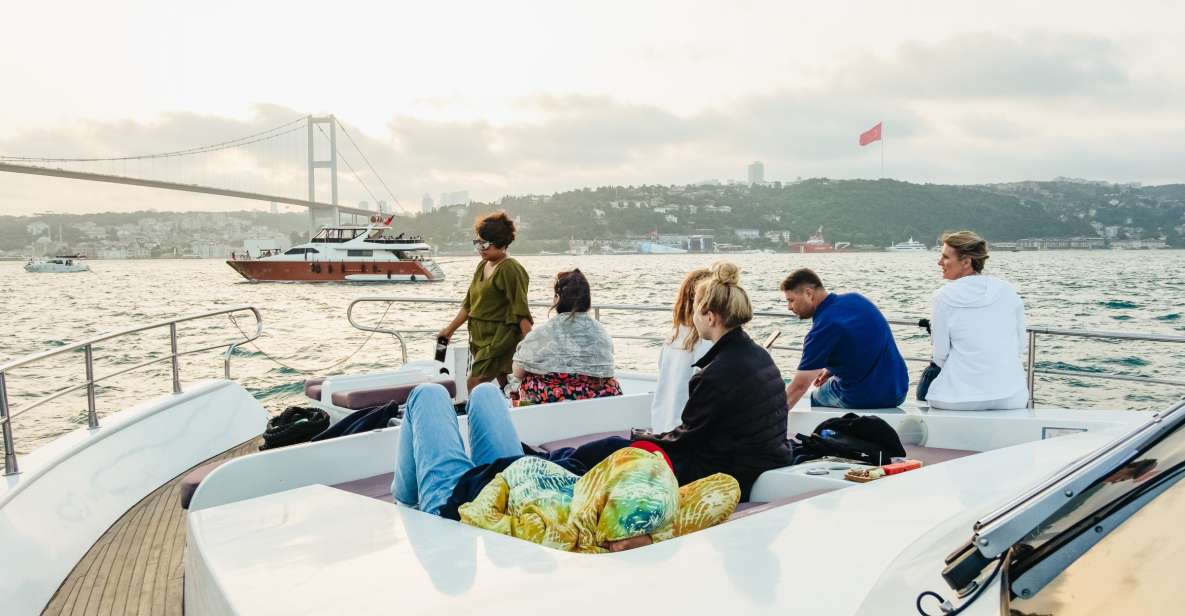 View riverbank monuments such as the Dolmabahçe Palace, the Ortaköy Mosque, and the Rumeli Fortress from the open-air deck of your luxury boat, all lighted by the lovely evening light.
